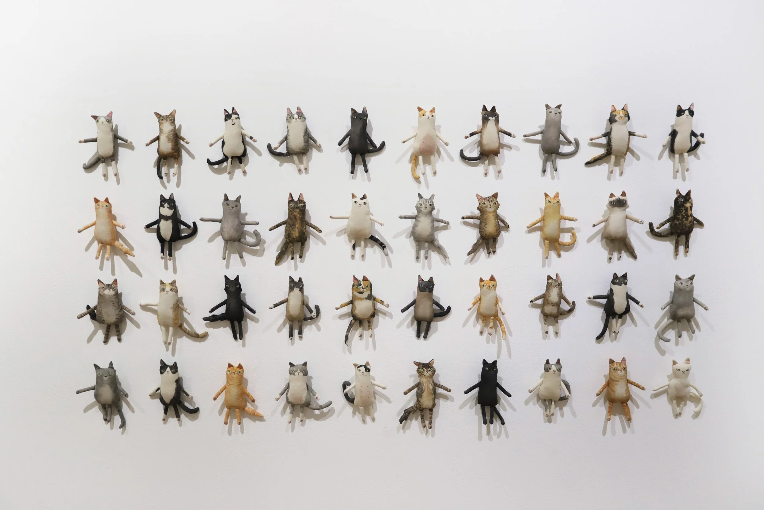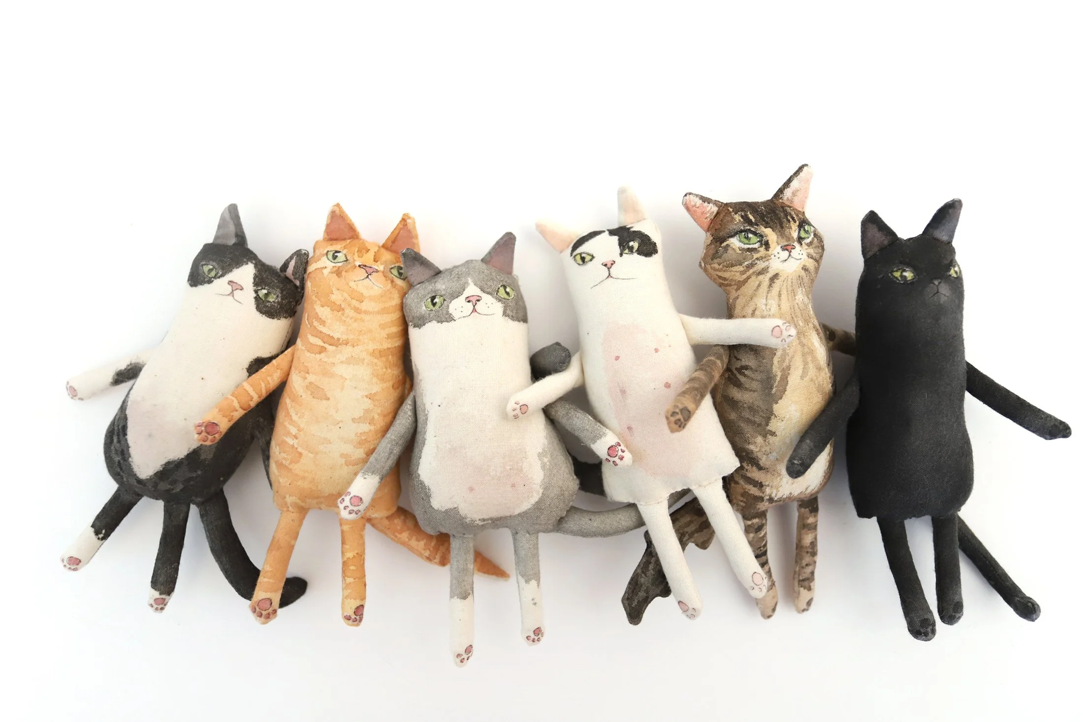 This installation is an ode to all our feline friends that kept us company and gave us comfort during the pandemic—helping get us through it as we stayed at home spending far more time with our pets and much less with other humans. Each tiny sewn, stuffed and painted cat is portrait of a REAL cat that supported myself and my friends during the pandemic. Bongo, Tabooli, Moonshine, Lady Batman, Harpy, Donut, Alma, Frippy…just to name a few! It was created for Squee, an exhibit at Towson University’s Center for the Arts Gallery. Scrap muslin, stuffing, ink, & watercolors. 26" x 50" each kitty is about 5” x 3” x 1” 2021