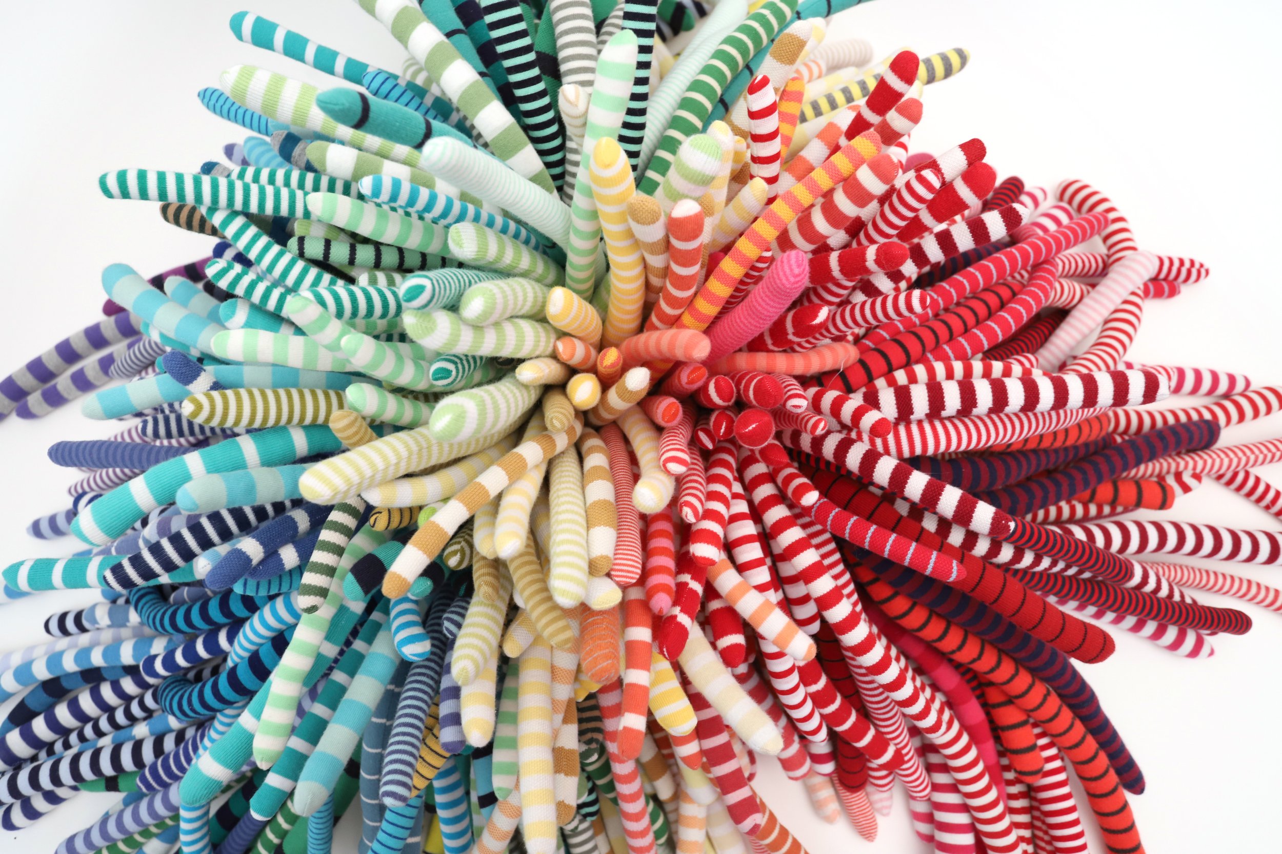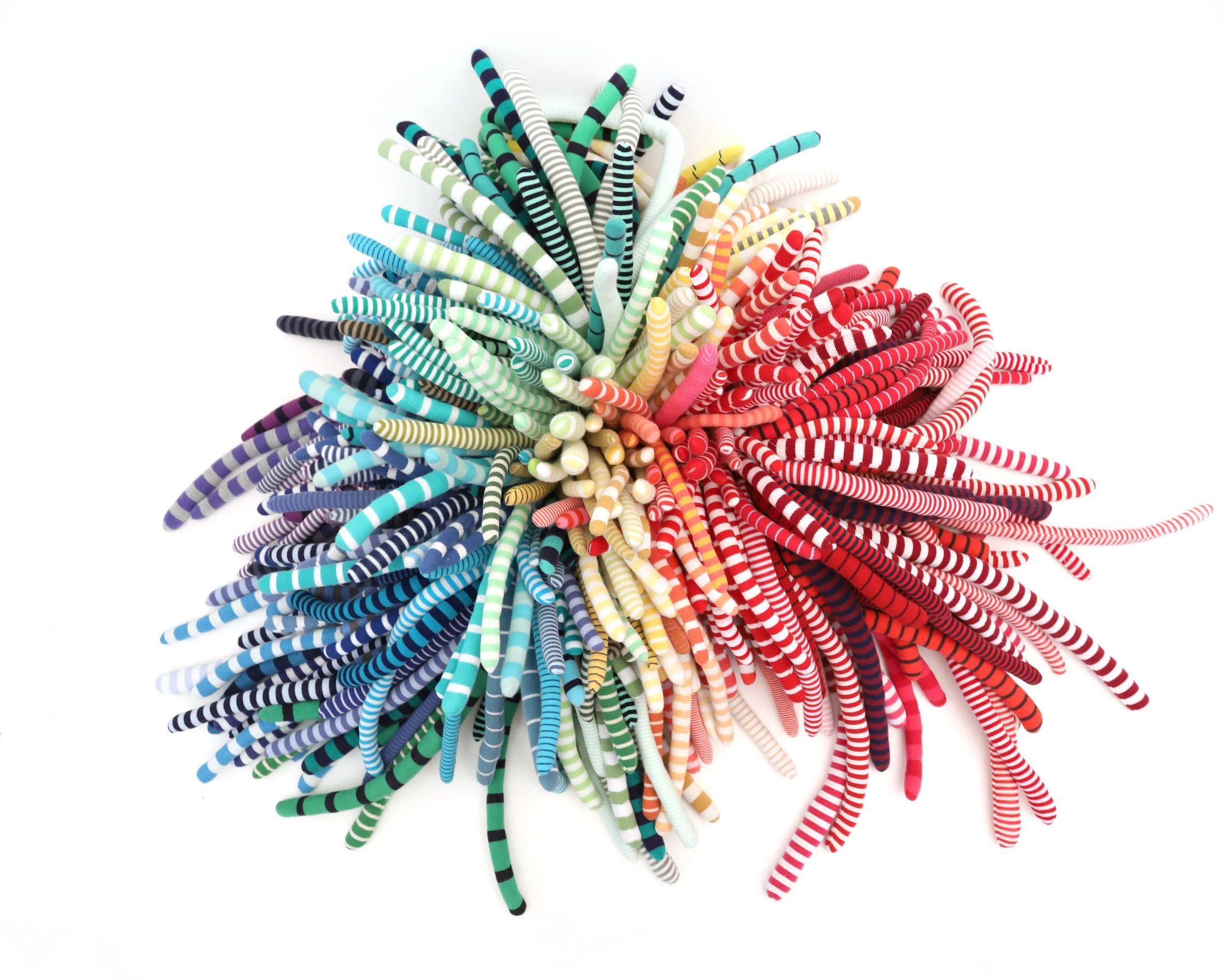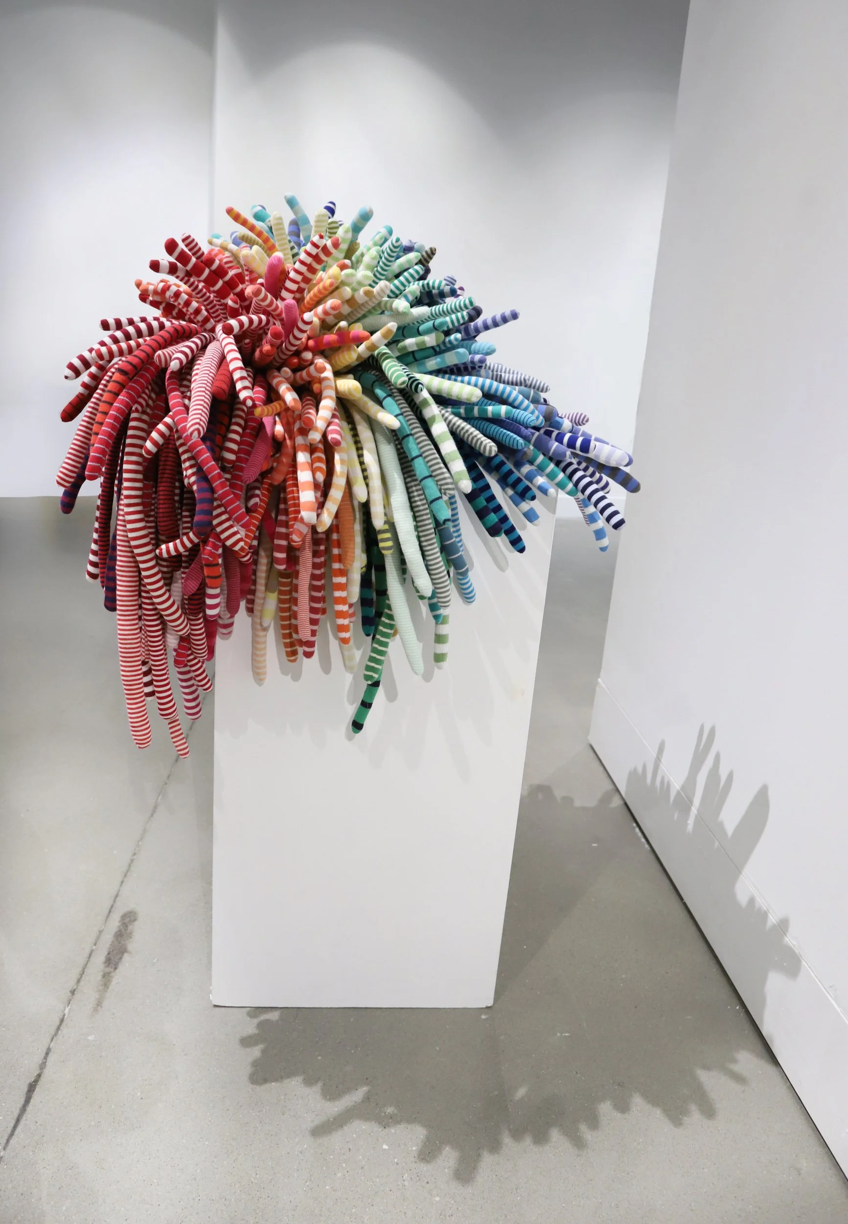 This soft sculpture was started in 2020 and completed in 2023 for display in Again, an exhibit at Towson University’s Holtzman MFA Gallery. It was created from scraps of striped shirts, leftover pieces from monster making in an attempt to use up as much material as possible from my daily art practice. It was a meditative process to sew, cut, turn and stuff each striped tendril, and then once amassed, to hand stitch them together. It changes size and shape depending on how it lays or drapes. I would love to expand on this piece over time and see it grow even larger. Recycled clothing, new fiberfill stuffing, thread. 2023