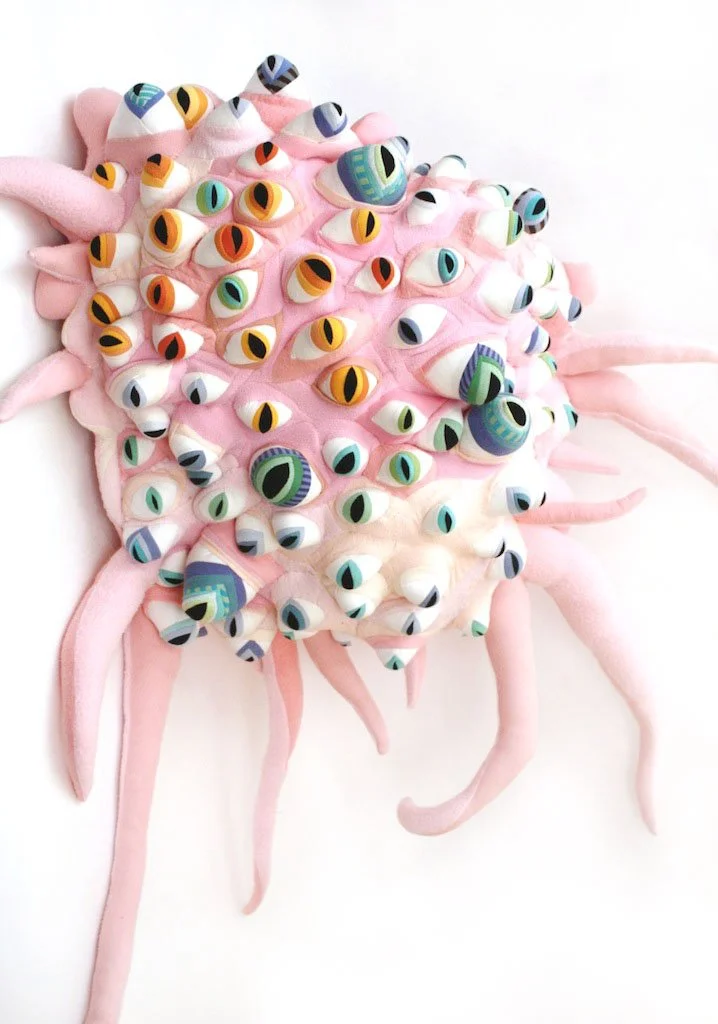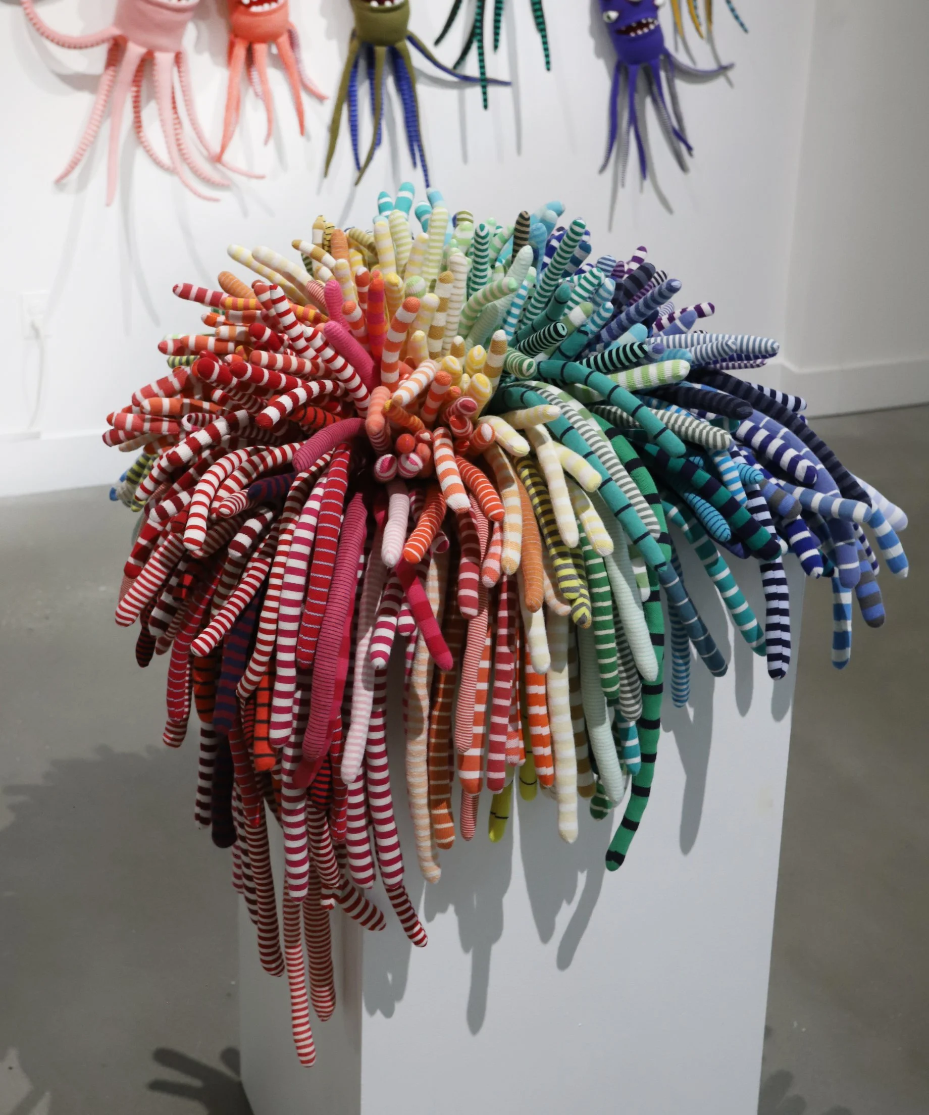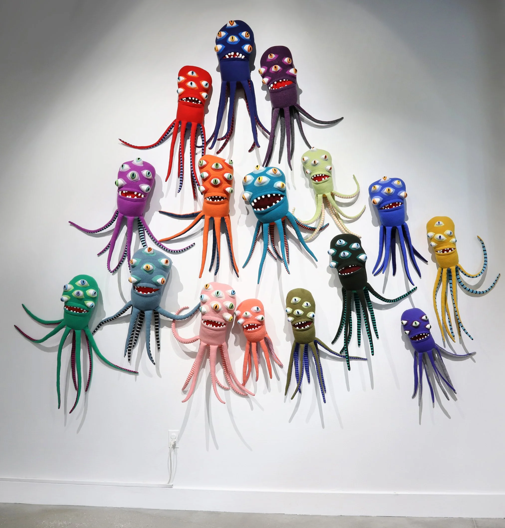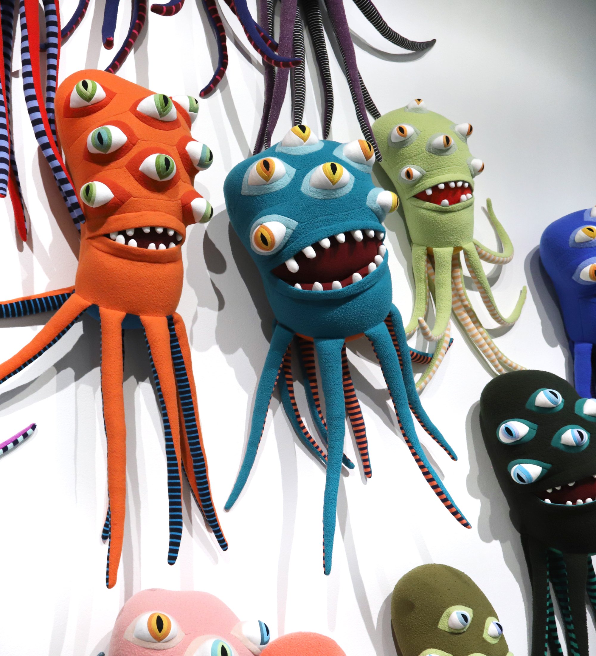 This soft sculpture installation is comprised of sixteen multi-eyed squids, each handmade from recycled clothing and hung in a mass as if floating up the wall. Displayed in Again, an exhibit at Towson University’s Holtzman MFA Gallery. Recycled clothing, sweatshirts, t-shirts, fleece, new fiberfill stuffing, thread. approx 10’x 10.’ 2023