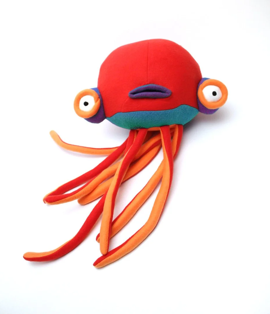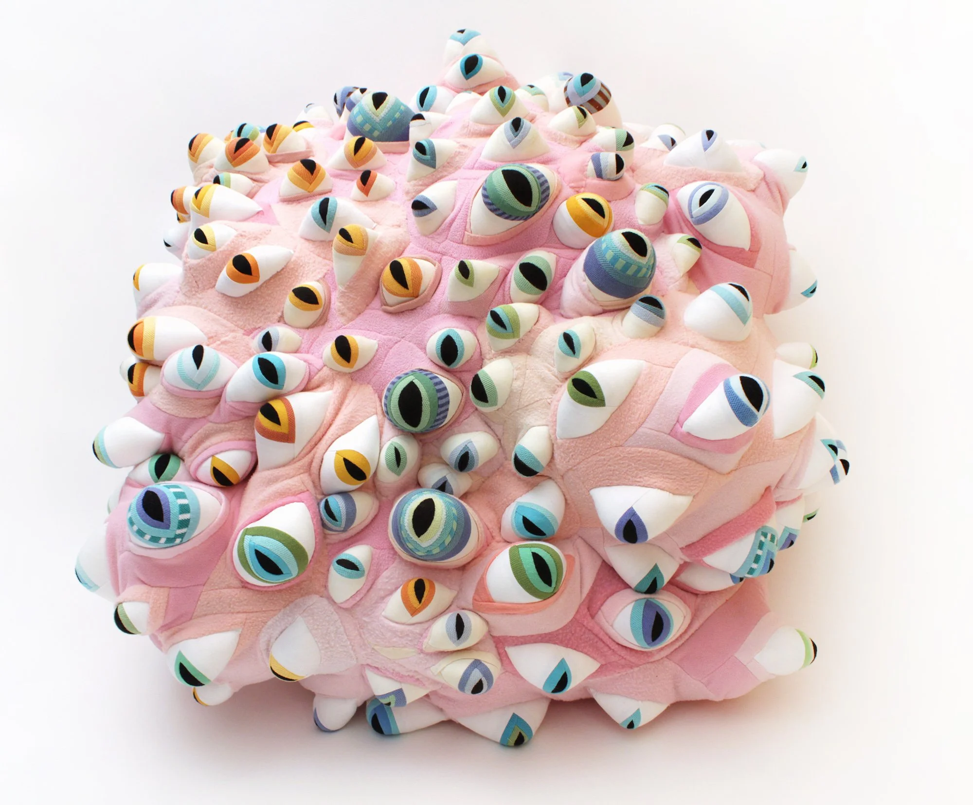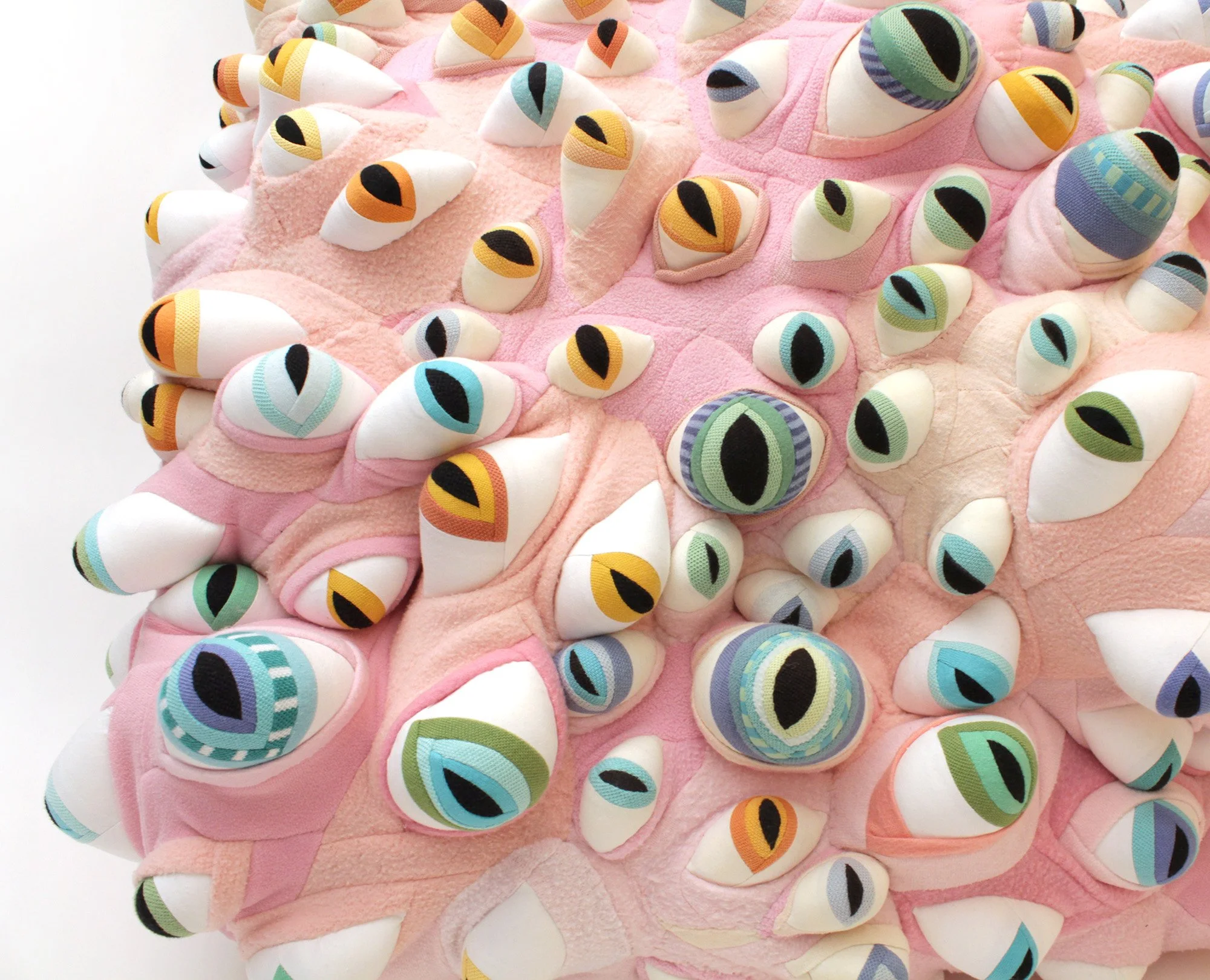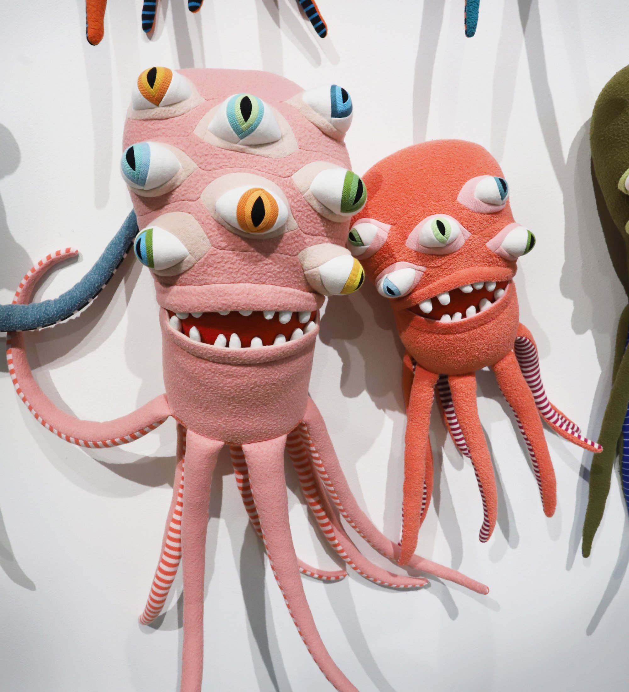 This soft sculpture installation is comprised of sixteen multi-eyed squids, each handmade from recycled clothing and hung in a mass as if floating up the wall. Displayed in Again, an exhibit at Towson University’s Holtzman MFA Gallery. Recycled clothing, sweatshirts, t-shirts, fleece, new fiberfill stuffing, thread. approx 10’x 10.’ 2023